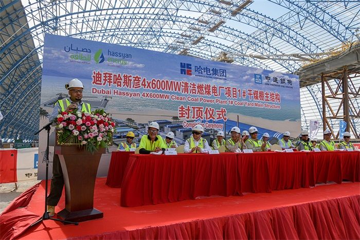 At 14:00 on May 22 local time in Dubai, the Dubai’s Hassyan 4x600MW Clean Coal-fired Project witnessed the key milestone work — the main truss structure of the dry coal shed at Coal Storage Yard 1 of the Dubai Hassyan Project was capped ten days ahead of schedule. A ceremony was held at the site in the presence of HEI, the Project Owner Hassyan Energy, the investment partner ACWA Power and GE, as well as representatives of the parties involved in the project.