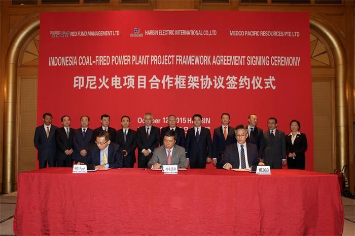В 9 часов 12 октября 2015 г., в отеле Шангри-Ла Харбина президент и генеральный директор HEI Го Юй , президент компании Hong Kong RED Capital Group Limited и генеральный директор индонезийской MEDCO PACIFIC RESOURCES(далее MEDCO RESOURCES) подписали рамочное соглашение о сотрудничестве по проекту ТЭС 2×1000 мВт в Индонезии на условиях генерального подряда и инвестиций . На церемонии подписания присутствовали председательНародного политического консультативного совета провинции Хэйлунцзян Ду Юйсинь, вице-губернатор Ху Яфэн и президент совета директоров и секретарь партийного комитета Харбинской Электроэнергетической Корпорации Цзоу Лэй. Секретарь партийного комитетат и вице-президент HEI Чуй Аймин вел церемонию подписания.