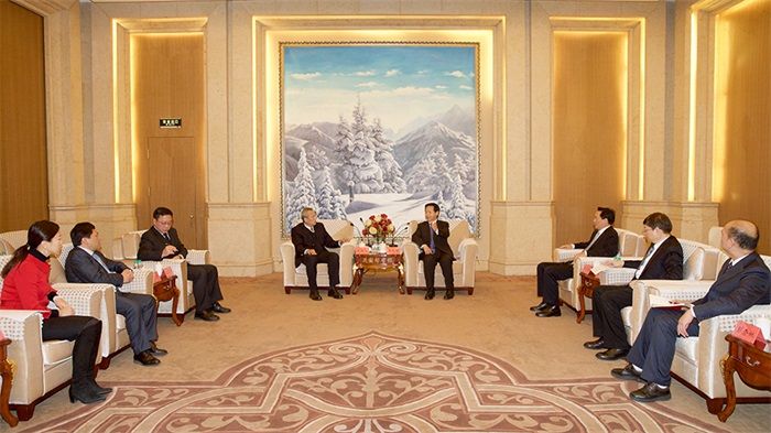 Секретарь парткома провинции Хэйлунцзяна г-н Wang Xiankui (четвертое место справа) встретился с президентом Фонда Шелкового Пути г-ном Wang Yanzhi (четвертое место слева), президентом ОАО « Харбинская Энергетическая Компания» г-ном Wu Weizhang (третье место слева) , и председателем правления компании «HEI» г-ном Guo Yu (второе место слева)