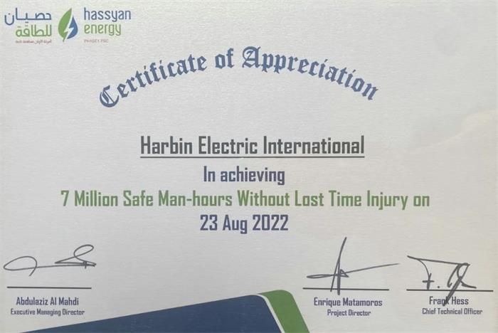 Недавно на участке строительство проекта Dubai Hassyan, заключенного компанией Harbin Electric International Co., Ltd. (HEI), достигло 7 миллионов безопасных человеко-часов без утраченных травм. Г -н Абдулазиз Аль Махди, исполнительный управляющий директор проекта, присудил Сертификат благодарности проектной команде HEI.