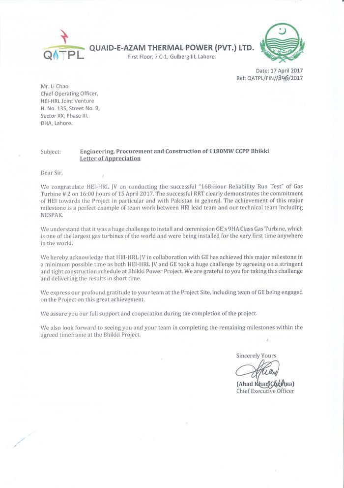 Проект «Bhikki» в Пакистане является объектом «под ключ» компании «HEI», является первой электростанцией комбинированного цикла с максимальной мощностью, построенной китайским предприятием за границей, и ЭСКЦ 209 HA класс H с самым высоким КПД в мире. Энергоблок №1 был соединен с энергосистемой 9 марта 2017 года после семнадцати с половиной месяцев работы. Энергоблок №2 также успешно прошел 168-часовые эксплуатационные испытания под неослабными усилиями компании «HEI». Заказчик--генеральный директор, господин Чима, направил благодарственное письмо, в котором он выражает свою высокую оценку и благодарность. Заказчик--генеральный директор, господин Чима, заявляет, что коллектив компании «HEI» осуществил строгий контроль в отношении проекта, уделял высокое внимание на безопасность, использовал многоуровневый контроль в отношении управления качеством. Компания безукоризненно осуществила 168-часовую надежную эксплуатацию и внесла выдающийся вклад в строительство проекта «Bhikki». Он надеется, что коллектив компании «HEI» будет в дальнейшем все с большей энергией и настойчивостью создавать новые чудесные объекты.