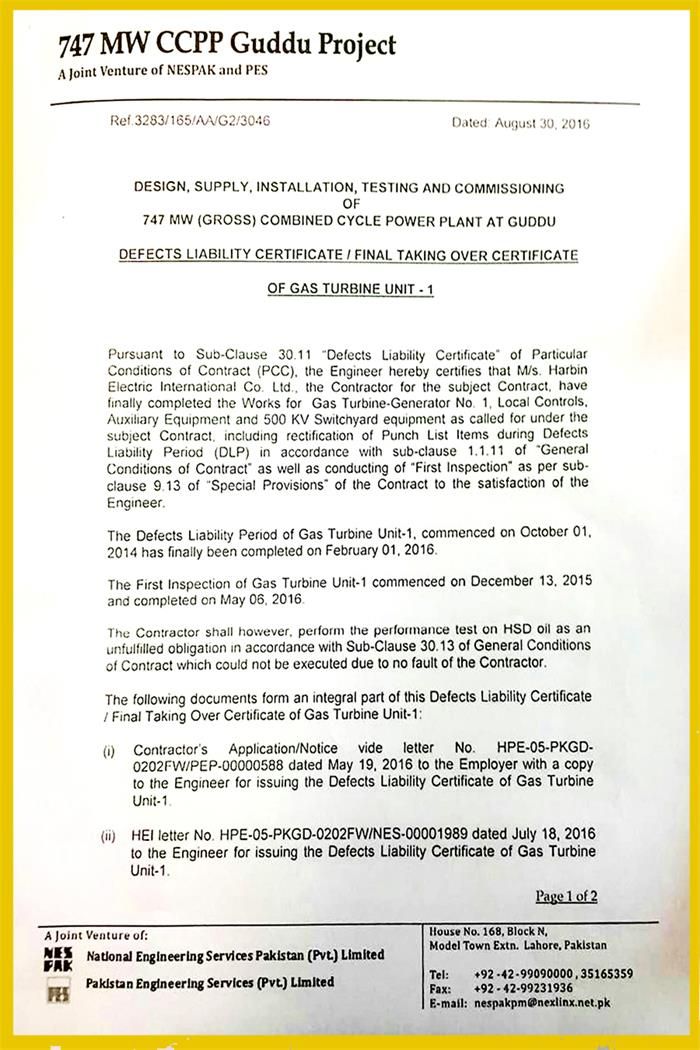 31 августа 2016 года газовая турбина № 1 в выполняемом компанией HEI проекте Guddu электростанции комбинированного цикла (747 МВт) в Пакистане получила сертификат DLC, выданный пакистанским заказчиком и надзорной компаниейNESPAK, завершена официальная передача установки заказчику. К настоящему времени уже на две газовых турбины проекта Guddu выданы сертификаты DLC, сейчас ведутся работы по сертификации всей станции.