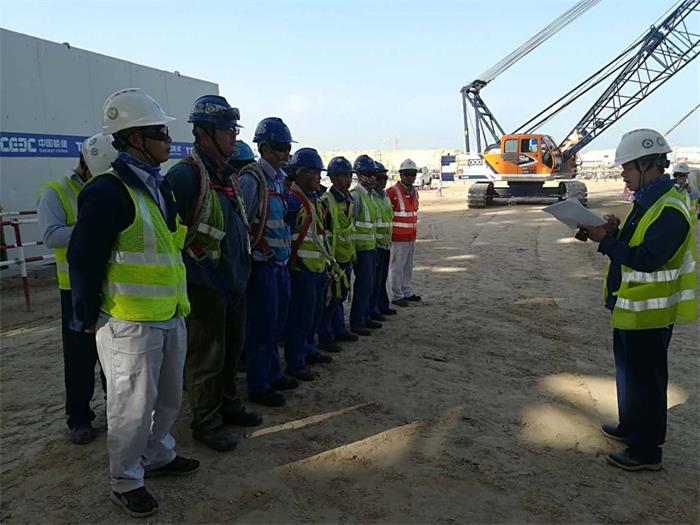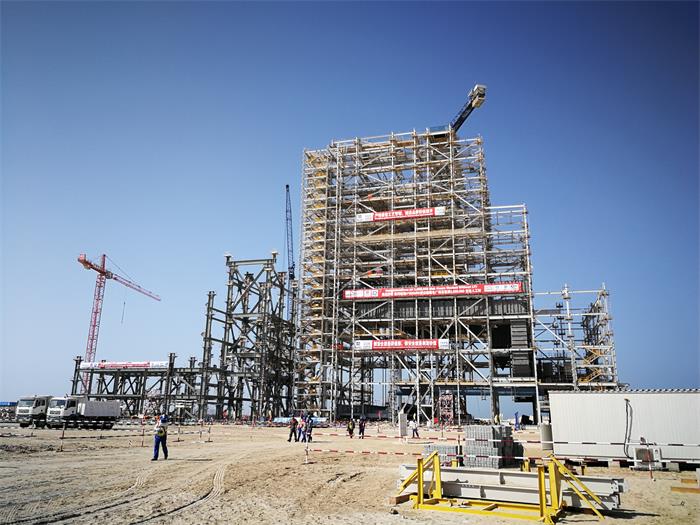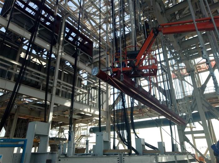 El proyecto de Hassyan es un proyecto importante en un nodo de "La Franja y La Ruta", el cual se garantizará el suministro eléctrico a la Expo Universal de Dubái 2020. En el proyecto de Hassyan se aplican los estándares más altos del mundo y usa gas natural y carbón limpio como combustibles, los cuales pueden respaldarse mutuamente al 100%. HEI ha avanza paulatinamente en la construcción del proyecto siguiendo a rajatabla el plan previsto e implementa una gestión estandarizada de Salud, Seguridad y Medioambiente. El colector de salida de techo de la superficie de calefacción de la caldera n.º 1 del proyecto de Hassyan alcanza las 18,6 toneladas de peso, para la que se empleó una grúa de brazo horizontal de 80T para la tarea de elevación. La elevación media para el montaje fue de 5,7 m, y los soportes colgantes fueron llevados y montados por personal subido en elevadores de personas, Antes de montar el colector de salida de techo, TEPC, empresa encargada de la construcción del proyecto de Hassyan, llevó a cabo preparativos de seguridad y puso al corriente de los detalles técnicos de la operación. El departamento de ingeniería, el departamento de calidad y los ingenieros de GE comprobaron y confirmaron la limpieza del interior del colector usando un endoscopio. Durante el izado, el contratante de Hassyan, HEI y TEPC supervisaron la seguridad del sitio para asegurar que el trabajo se desarrollase de forma segura y sin contratiempos. Para la instalación de la superficie de calefacción se empleó una nueva tecnología de construcción. Dependiendo de que el hogar se caracterice por ser anterior o posterior, la instalación de la caldera divide en instalación en dos partes, una correspondiente al hogar anterior y otra al posterior. Parte correspondiente al hogar anterior: en las posiciones de los capiteles BB, BC, BD y BE se distribuyen 4 elevadores hidráulicos (8 unidades de 330 t+8 unidades de 220 t), los cuales van elevando progresivamente hasta su sitio a la totalidad de equipos, como son la pantalla de agua y vigas ensambladas A, B, C y D, los sobrecalentadores de las paredes laterales extensibles, el sobrecalentador de alta temperatura, el recalentador de alta temperatura, el sobrecalentador de la pantalla posterior, el sobrecalentador de la pantalla medianera, el sobrecalentador de techo, vigas de atirantar, etc.