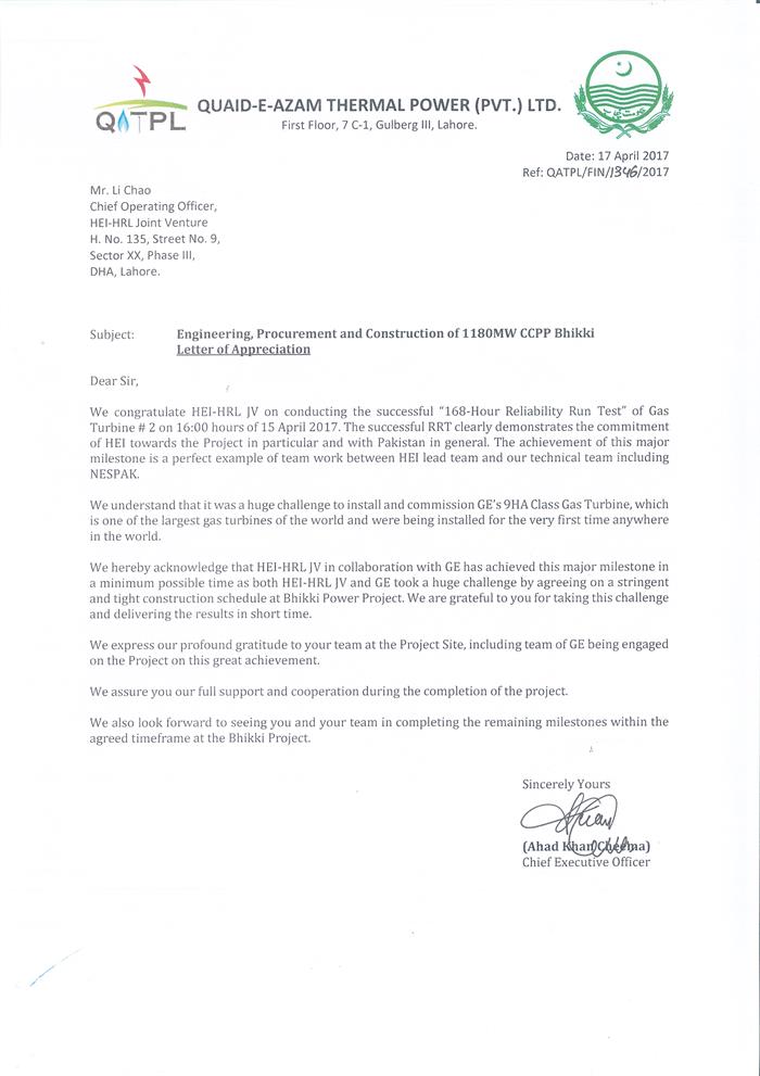 El proyecto de Bhikki en Pakistán es un proyecto EPC de llave en mano comisionado a HEI, y se trata del primer proyecto en el extranjero de una central de ciclo combinado de clase H de 209HA con la mayor capacidad y rendimiento realizado por una empresa china. La unidad n.º 1 fue sincronizada a la red el 9 de marzo de 2017, tras 17 meses y medio, y ahora tras los esfuerzos continuados de HEI, la unidad n.º 2 ha pasado de una vez 168 horas de pruebas de fiabilidad, lo cual ha propiciado que el sr. Cheema, CEO de los propietarios, haya enviado una carta de agradecimiento con grandes elogios. El sr. Cheema expresó cómo el equipo del proyecto de Bhikki de HEI controló estrictamente el plan del proyecto, prestó gran atención al trabajo seguro, comprobó en cada nivel la gestión de calidad, y logró el hito de completar 168 horas de pruebas de fiabilidad, con lo que ha realizado una aportación sobresaliente a la construcción del proyecto del proyecto de Bhikki. Asimismo deseó que el equipo de HEI siga esforzándose para poder crear nuevos milagros en los trabajos venideros.