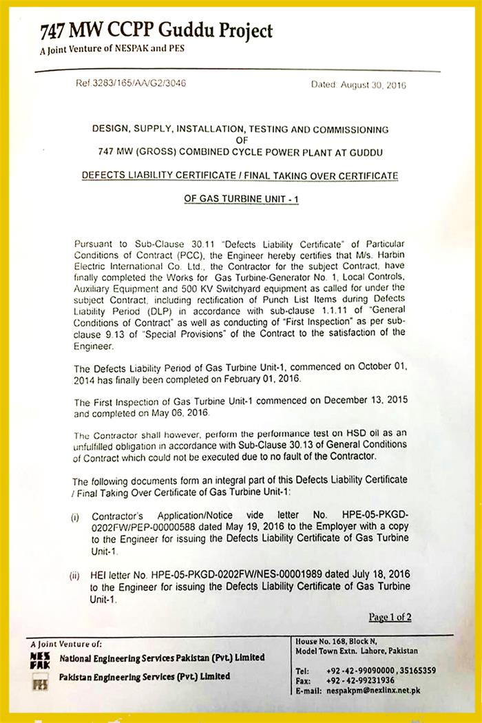 El 31 de agosto de 2016 la turbina de gas n.º 1 del proyecto de una central de ciclo combinado de 747MW en Guddu, Pakistán comisionado a HEI obtuvo el certificado DLC emitido por la empresa propietaria y supervisora NESPAK, concluyendo formalmente su entrega. Con esto las 2 turbinas de gas del proyecto de Guddu en Pakistán ya han obtenido los certificados DLC, y ahora se están dedicando todos los esfuerzos por obtener el certificado DLC de toda la central.